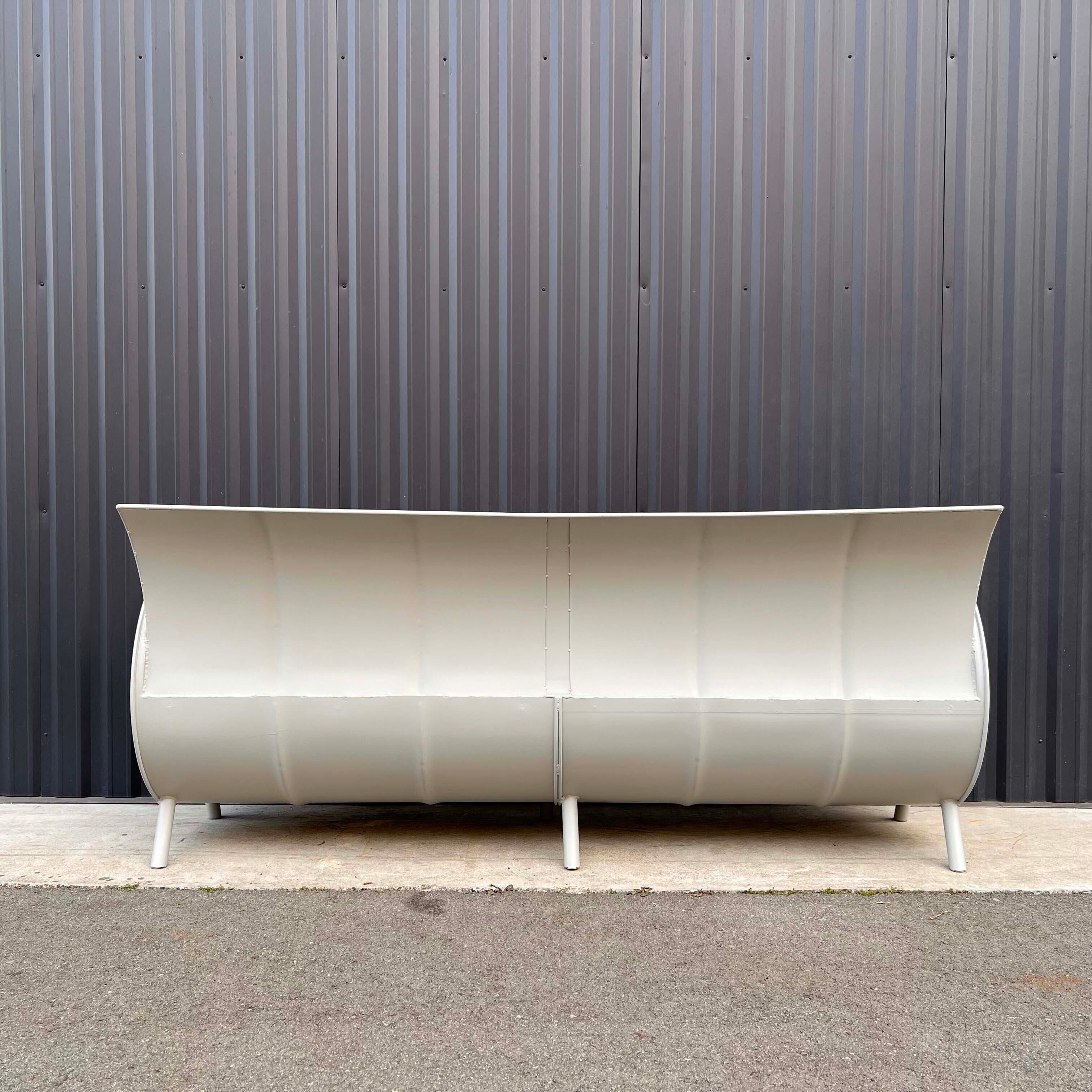 ドラム缶2缶を大胆にカット、溶接しワイルドでアメリカンなソファーに仕上げています。(ウレタン塗装仕上)